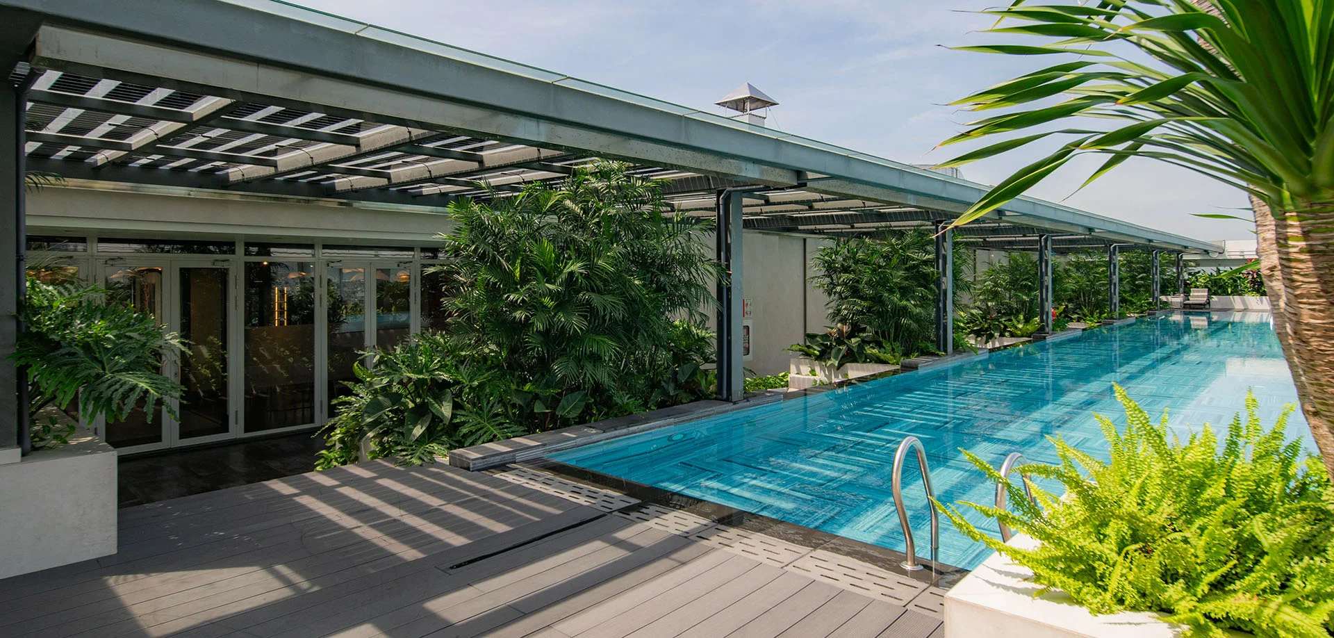 A rooftop escape where you can swim while watching planes drift across the skyline — a rare, relaxing view in the city.